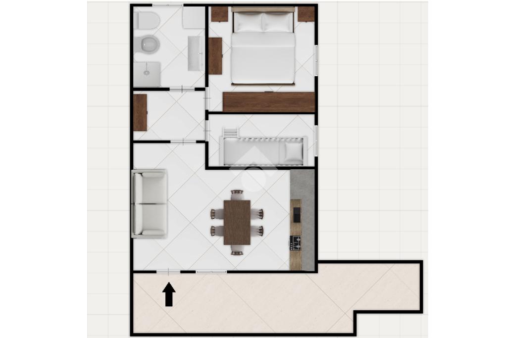 Entrando nella soluzione ci accoglie la spaziosa e luminosa zona giorno con divano letto e cucina con accesso all'ampio balcone.