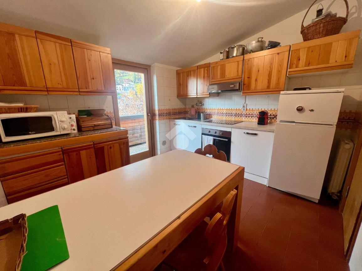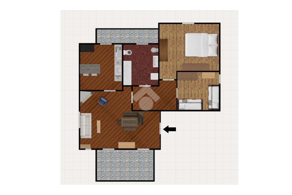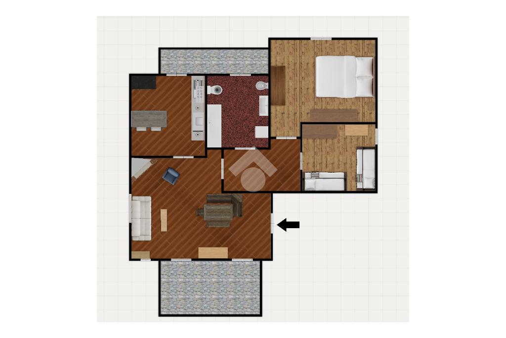 Accedendo alla soluzione ci accoglie l'ampio soggiorno con divano letto e terrazza, la cucina risulta separata dalla zona giorno e affaccia sul balcone.
