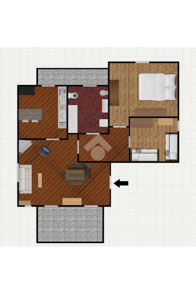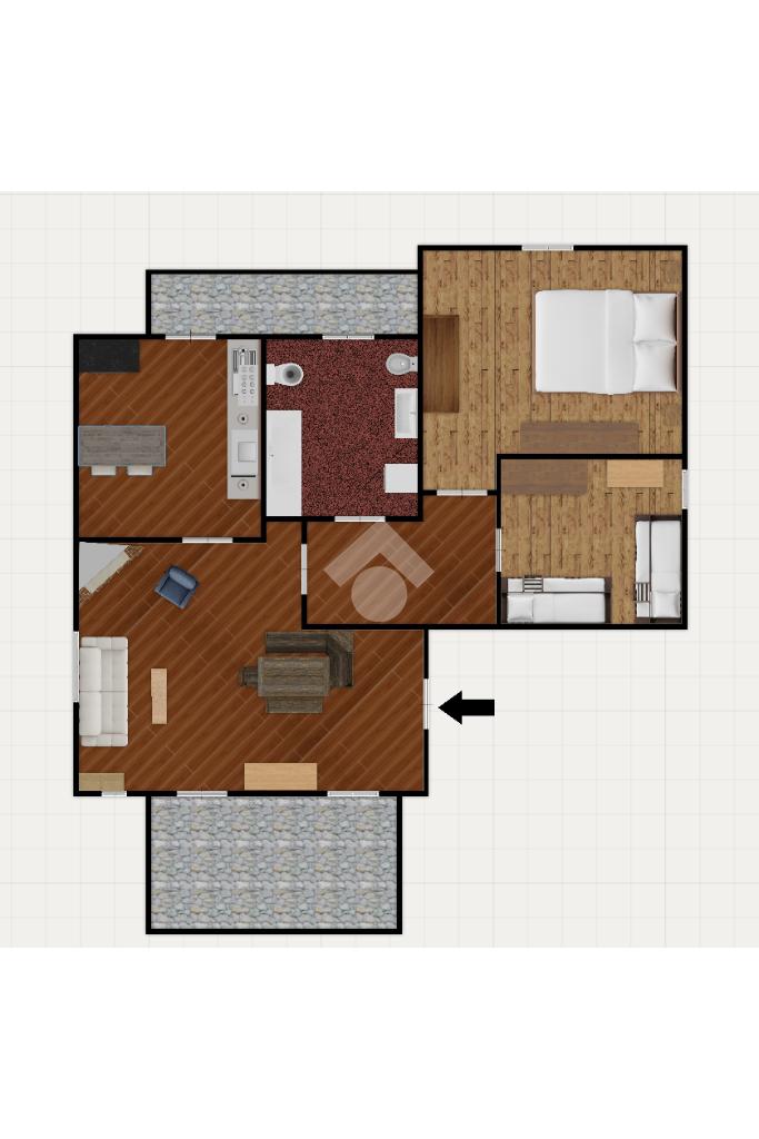 Accedendo alla soluzione ci accoglie l'ampio soggiorno con divano letto e terrazza, la cucina risulta separata dalla zona giorno e affaccia sul balcone.