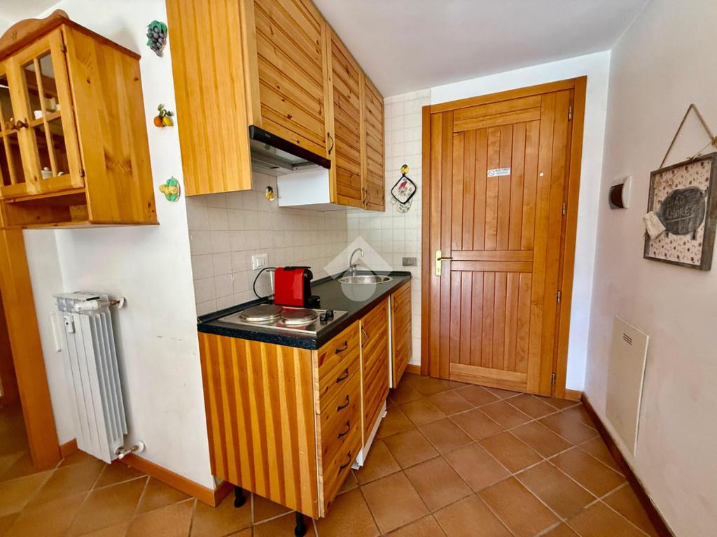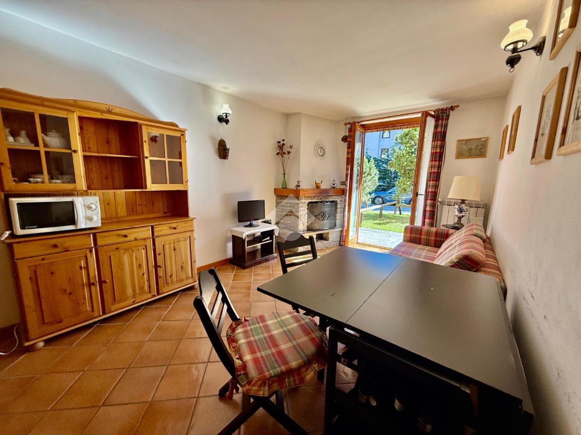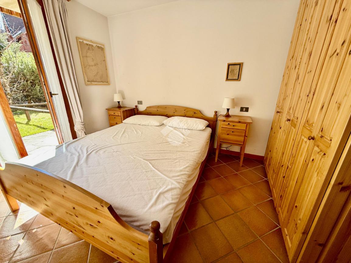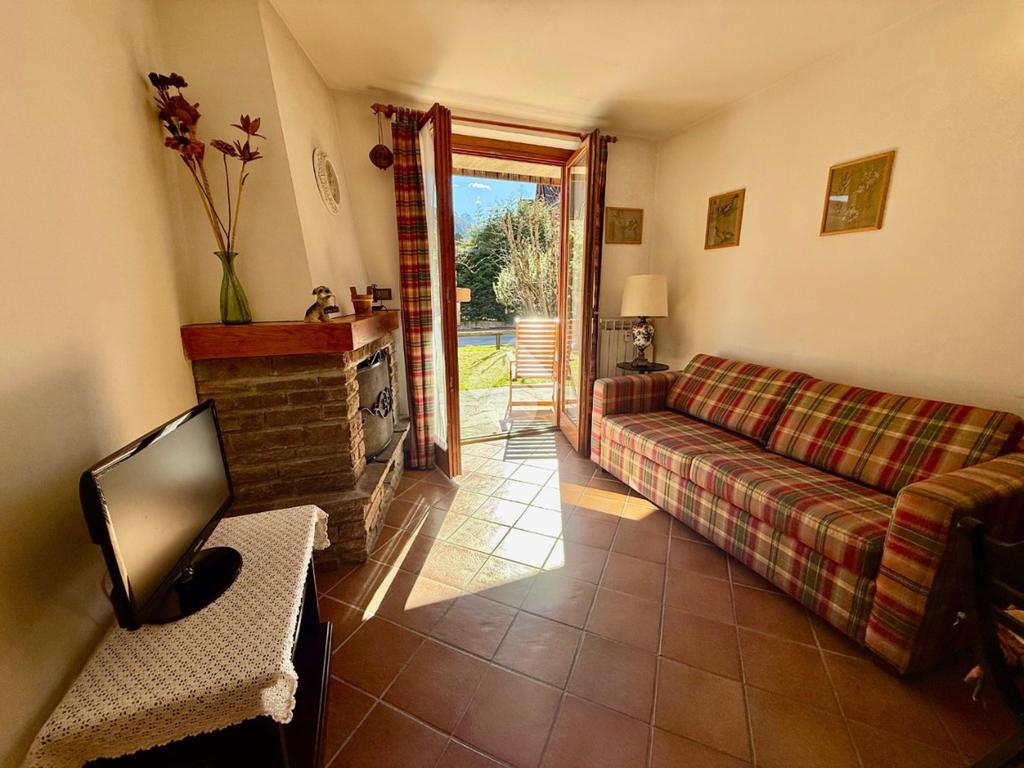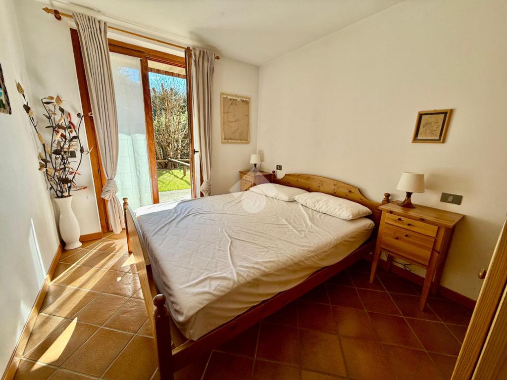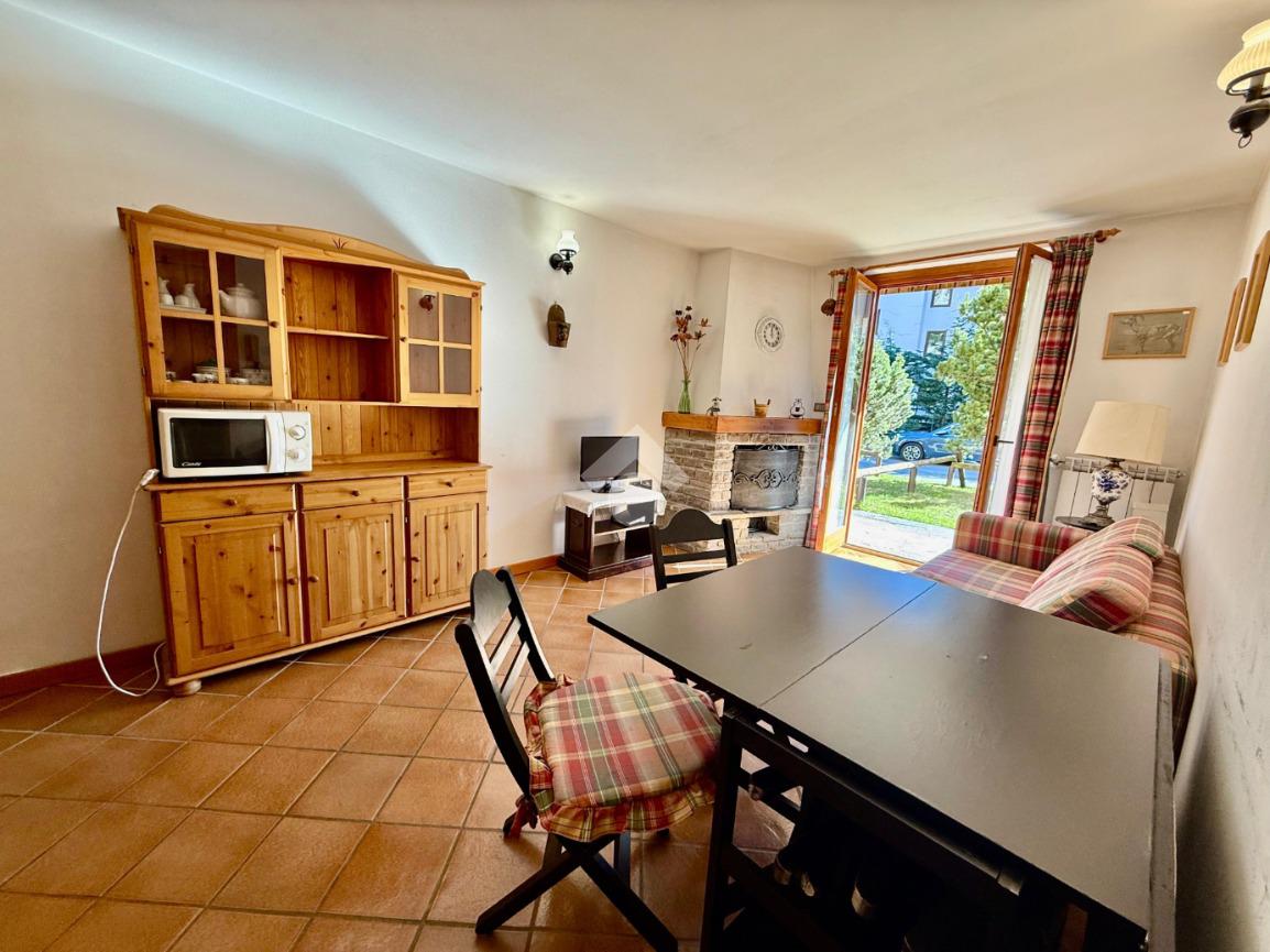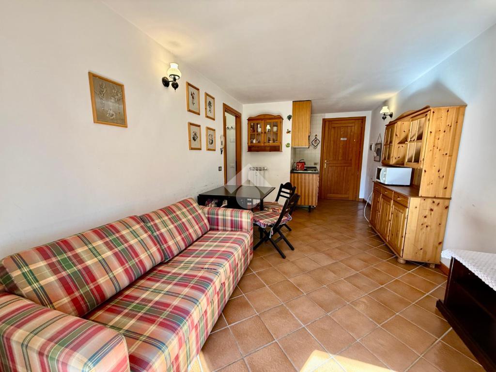 All'ingresso della soluzione ci accoglie la zona giorno con angolo cottura, divano letto e accesso al giardino di proprietà.
