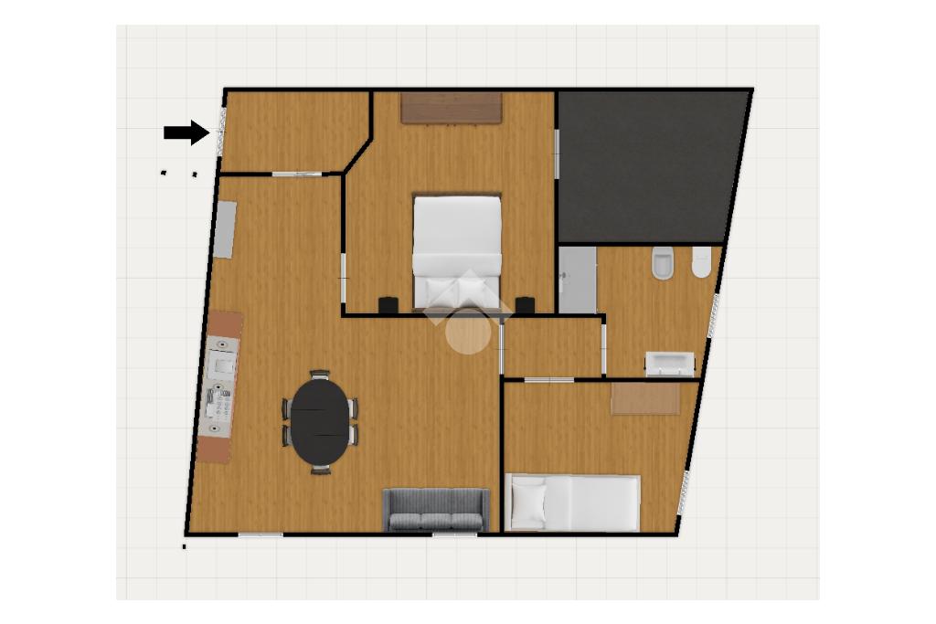 Composto da una camera matrimoniale, una cameretta, un bagno e zona giorno con cucina a 'vista'.