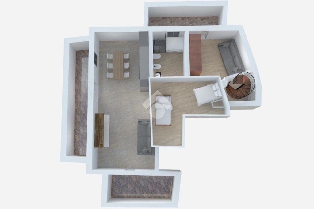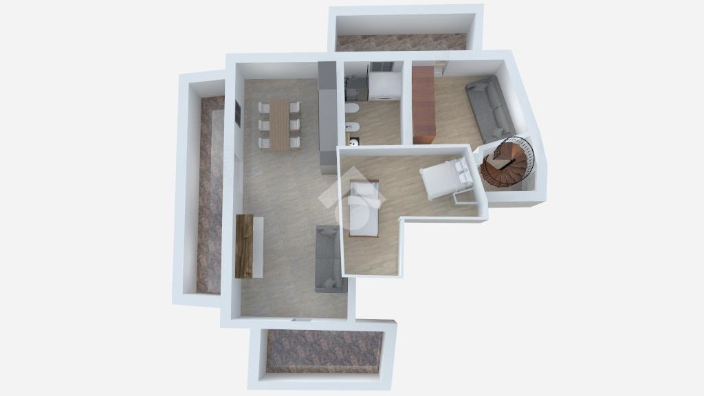 La soluzione risulta composta da zona giorno con cucina a 'vista' e accesso ai due ampi balconi, attraverso il disimpegno troviamo il bagno finestrato con doccia e la camera con balcone.