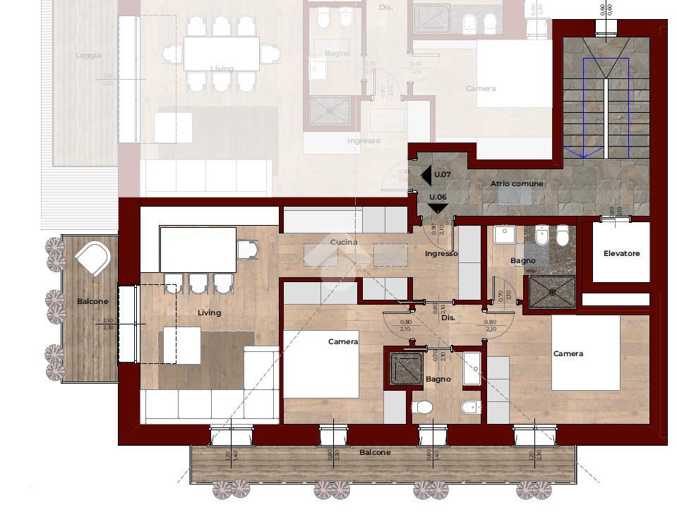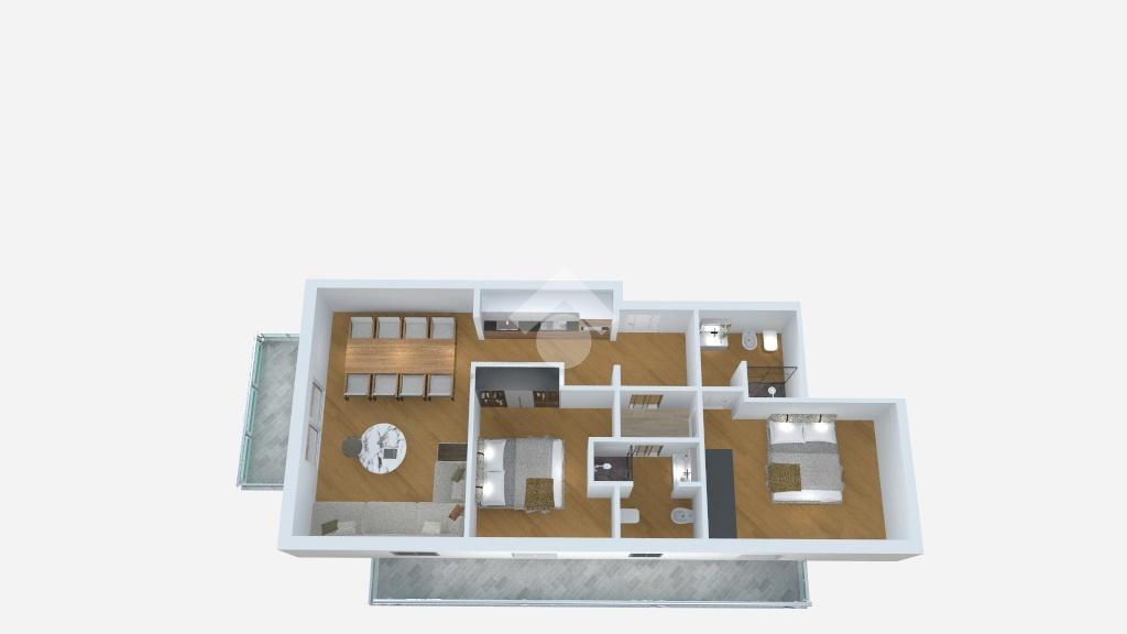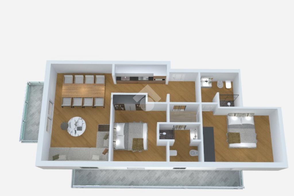 La soluzione risulta composta da zona giorno con angolo cottura, due camere matrimoniali, due bagni finestrati con doccia e due balconi.