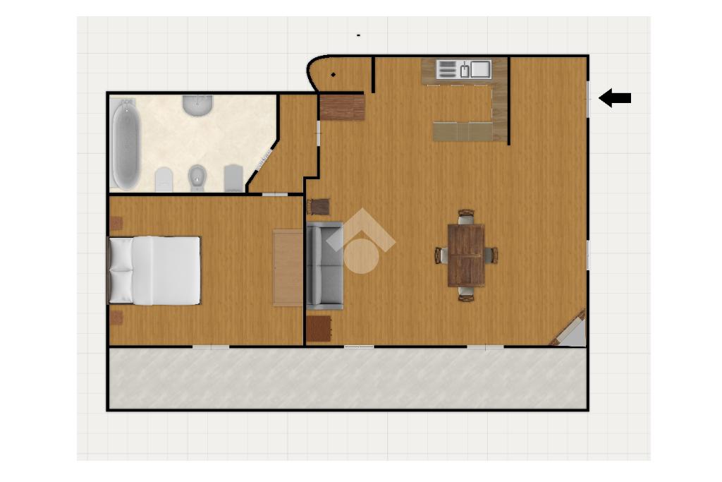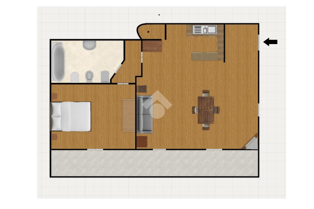 Accedendo alla soluzione ci accoglie l'ampio soggiorno con cucina a 'vista'con accesso al balcone, ripostiglio e divano letto.